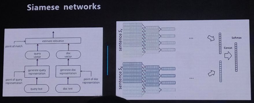 Siamese networks:通过搜索引擎里 Query 和 Title 的海量的点击曝光日志,用 DNN 把 Query 和 Title 表达为低纬语义向量,并通过 cosine 距离来计算两个语义向量的距离,最终训练出语义相似度模型。该模型既可以用来预测两个句子的语义相似度,又可以获得某句子的低纬语义向量表达。
