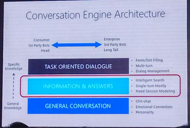 腾讯知文智能对话引擎的架构图如下。分为三层,由下而上依次为:general conversation是基础会话,主要包括用户闲聊、情感联系和用户个人信息等;information & answers是本次会议主要讨论分享的模块,包括智能搜索、单轮会话(single-turn mostly)和所需的会话模型;第三层是任务导向型的对话,包括词槽填充、多轮会话和对话管理(Dialog Management,DM)。