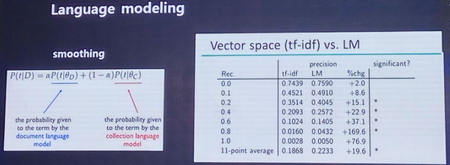 其次,采用了language model(简写LM)的方法,主要使用的是Jelinek-Mercer平滑法和Dirichlet平滑法,对于上面的词汇匹配问题表现良好,但是也存在平滑敏感的问题。