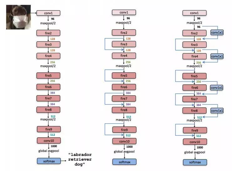 2016 年 11 月才发表的文章,一看论文的标题可以被镇住:SqueezeNet: AlexNet-level accuracy with 50x fewer parameters and < 0.5MB model size。文章直接说 SqueezeNet 有着跟 AlexNet 一样的精度,但是参数却比 Alex 少了接近 50 倍并且参数只需要占用很小的内存空间。这里的设计就没有 SegNet 或者 GoogleNet 那样的设计架构惊艳了,但 SqueezeNet 却是能够保证同样的精度下使用更少的参数。