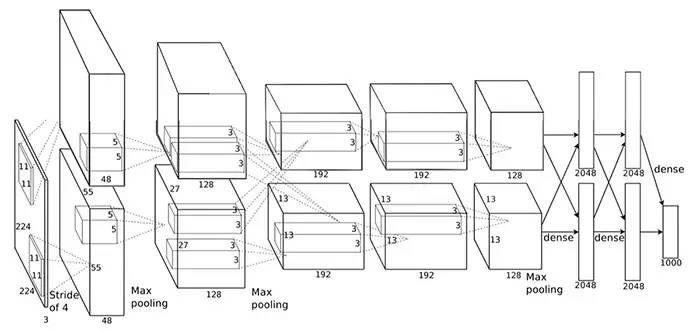 2012 年,Alex Krizhevsky 发表了 AlexNet,相对比 LeNet 它的网络层次更加深,从 LeNet 的 5 层到 AlexNet 的 7 层,更重要的是 AlexNet 还赢得了 2012 年的 ImageNet 竞赛的第一。AlexNet 不仅比 LeNet 的神经网络层数更多更深,并且可以学习更复杂的图像高维特征。