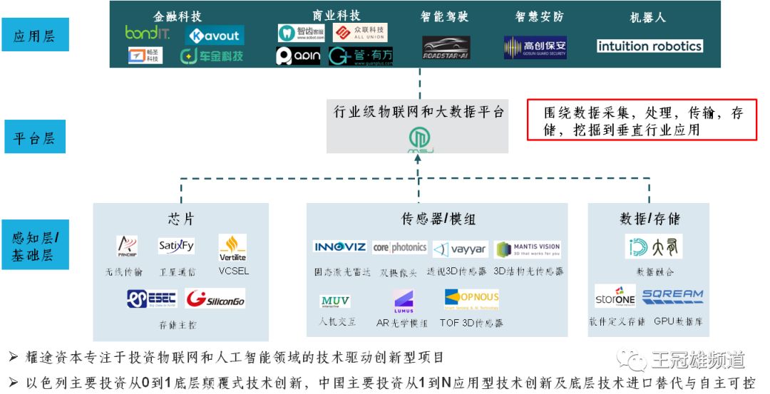 耀途资本在以色列投资布局了11家物联网和人工智能领域底层颠覆式技术,涉及智能传感(激光固态雷达,双摄底层算法,3D感知),卫星通信,智能投顾,AR,存储,人机交互技术和异构计算等细分行业。