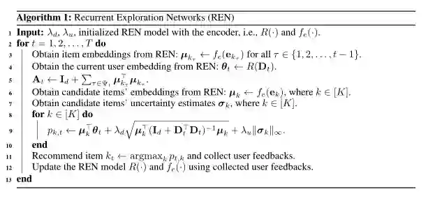 摘要:循环神经网络已被证明在推荐系统建模序列用户反馈方面是有效的。然而,它们通常只关注项目相关性,而不能有效地为用户挖掘多样化的项目,从而在长远来看损害了系统的性能。为了解决这个问题,我们提出了一种新型的循环神经网络,称为循环探索网络( recurrent exploration networks, REN),在潜在空间中联合进行表示学习和有效探索。试图平衡相关性和探索性,同时考虑到表征中的不确定性。我们的理论分析表明,即使在学习的表示存在不确定性的情况下,REN也可以保持速率最优的 sublinear regret(Chu等人,2011)。我们的实验研究表明,REN在合成和真实推荐数据集上都能获得令人满意的长期回报,表现优于最先进的模型。