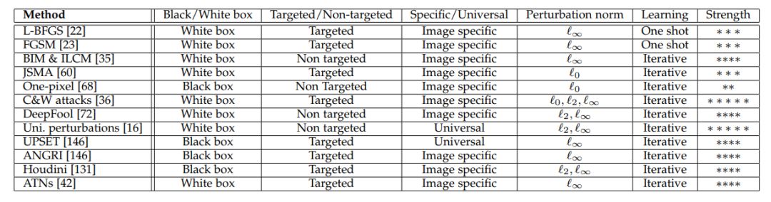 表 1:以上列举的各种攻击方法的属性总结:「perturbation norm」表示其限制的 p-范数(p-norm)以使对抗扰动对人类不可见或难以察觉。strength 项(*越多,对抗强度越大)基于回顾过的文献得到的印象。