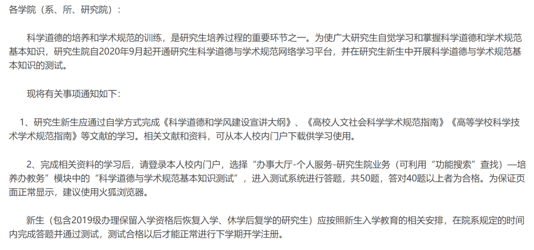 北京大学自2020年起,开通研究生科学道德与学术规范的网络学习平台。研究生入学后就要先自学相关建设宣讲大纲和规范指南。自学完毕还要完成相关测试,合格率通过方可过关。