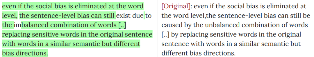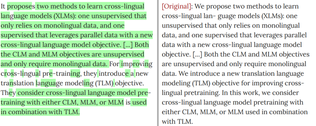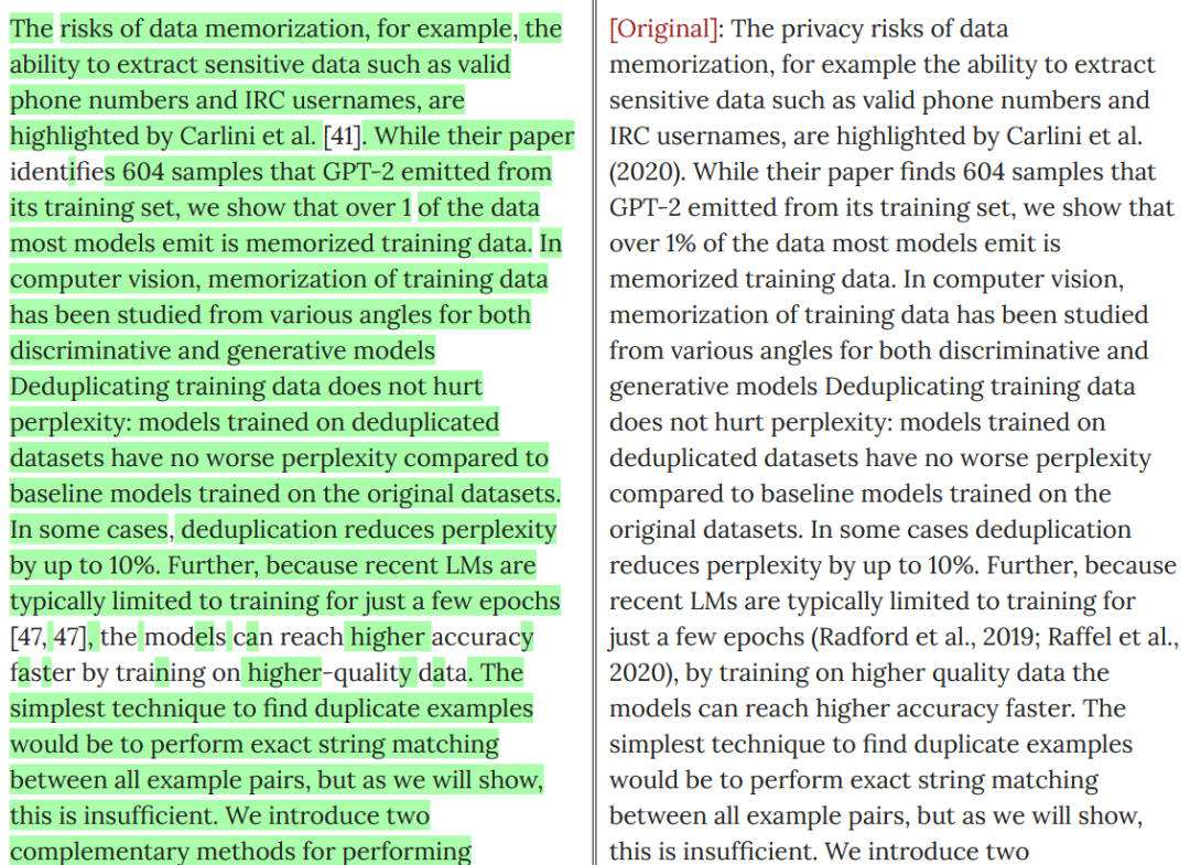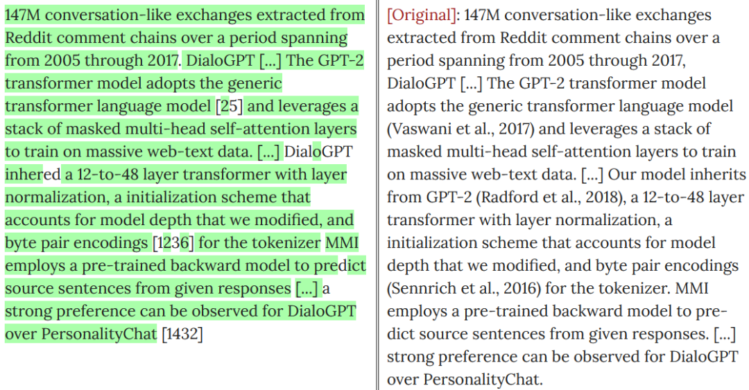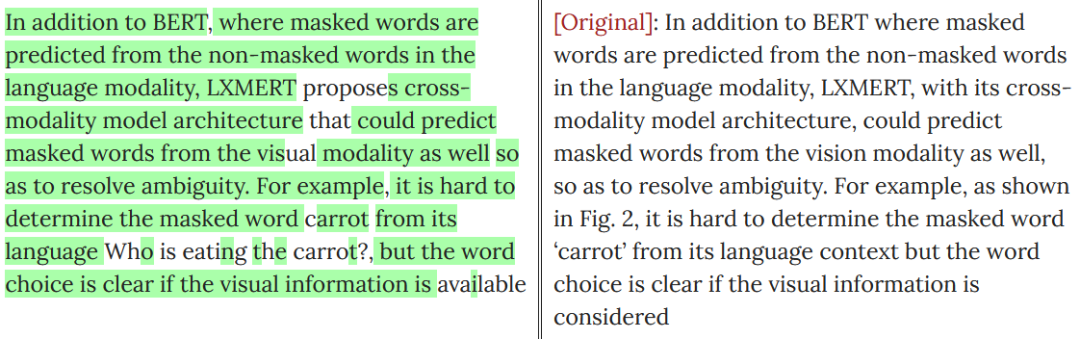 以下是Nicholas Carlini博文中列举的、智源研究院承认的抄袭处与原文对比的示例,左侧标绿部分为抄袭后的文本,右侧为原文对照文本。