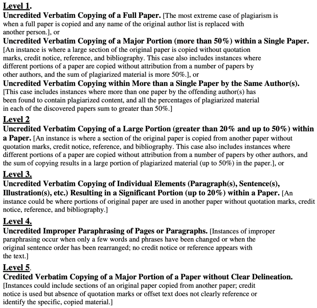 其中第一级是最严重的,定义为:未注明引用的、全文一字不差的照搬;未注明引用的、对主要部分超过50%的、一字不差的照搬;以及一名作者的多篇论文内都有一字不差的照搬、且总量超过50%。