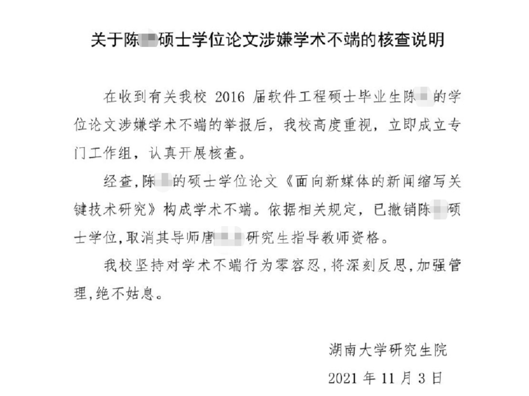 湖南大学立即开展相关核查工作,于2021年11月3日在微博发布说明,撤销了陈某的硕士学位。