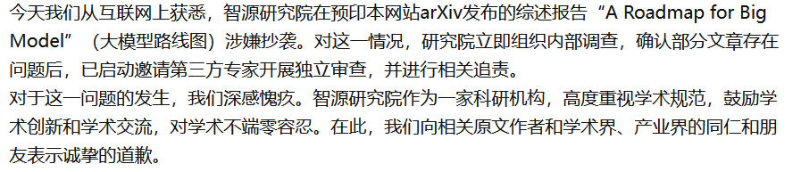 2022年4月13日晚,智源研究院作为这一综述文章的组织者,在知乎的官方账号上发表公开致歉信,称「从互联网上获悉」此事,承认涉事论文有抄袭的部分,并向学界与公众表示歉意。