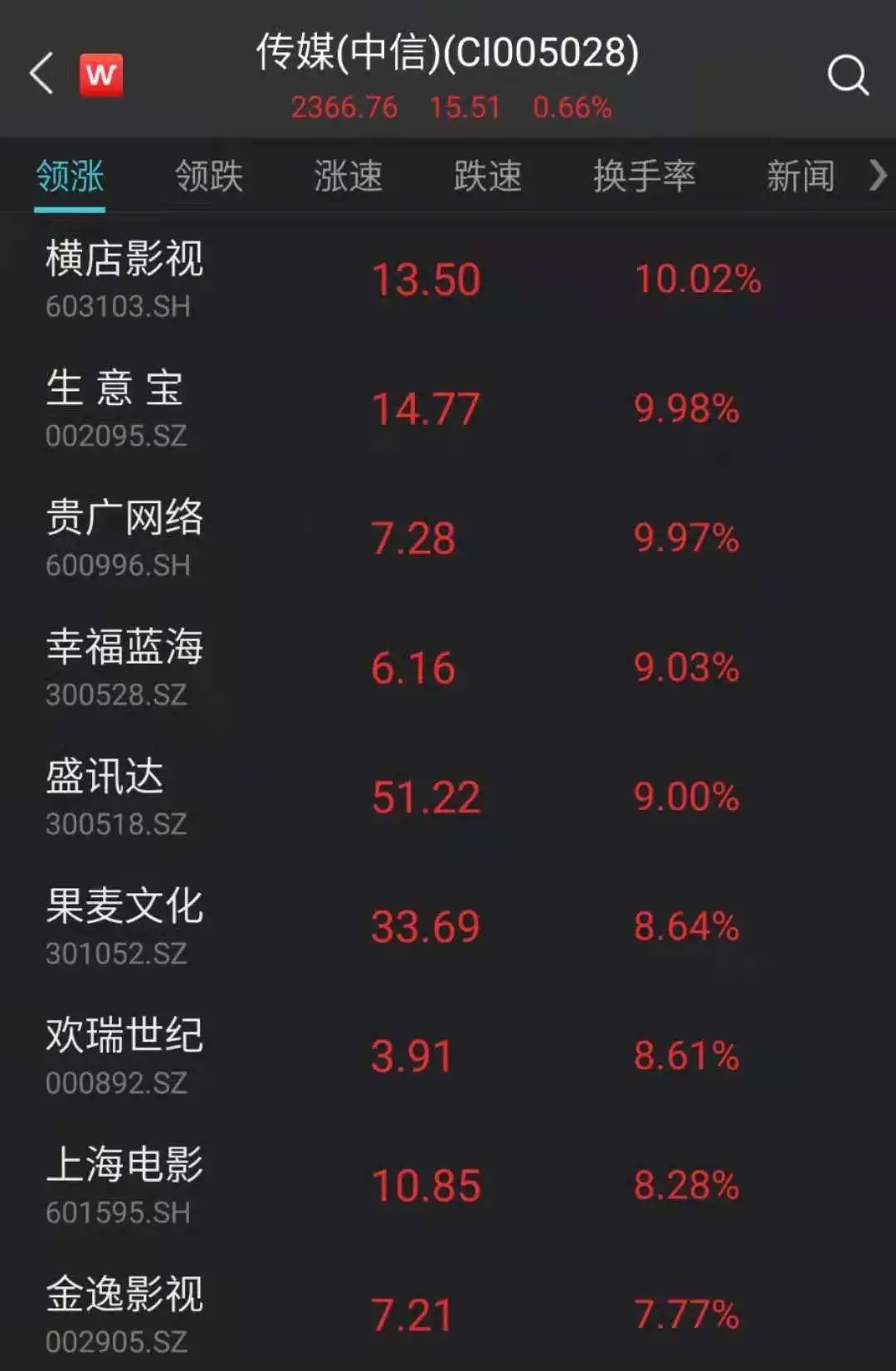 影视传媒板块继续走高,横店影视涨停,幸福蓝海、金逸影视、上海电影、果麦文化等跟涨。
