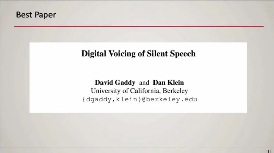 今年的最佳论文奖项颁发给了加州大学伯克利分校的研究《Digital Voicing of Silent Speech》。