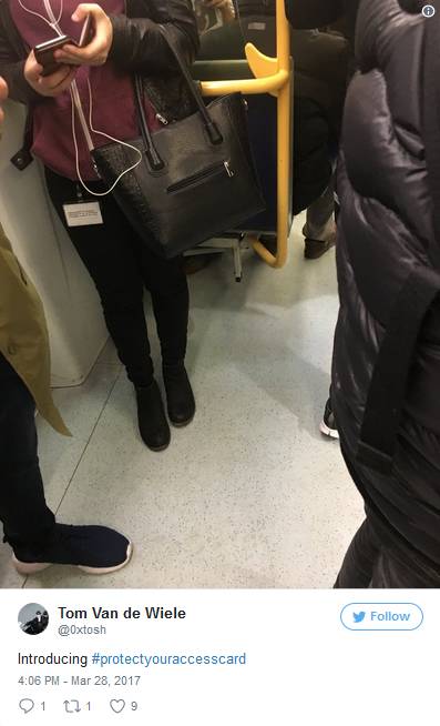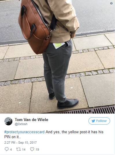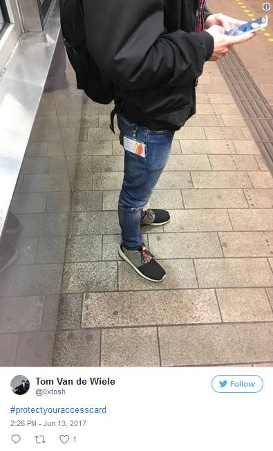 据外媒thenextweb报道,来自丹麦F-Secure的安全研究员Tom Van de Wiele近日展开了一项非常有趣的项目。这位出生在比利时的研究员拍下了人们将公司ID卡暴露在外面的照片并用#protectyouraccesscard(保护好你的门卡)的标签将它们分享到社交媒体平台上。
