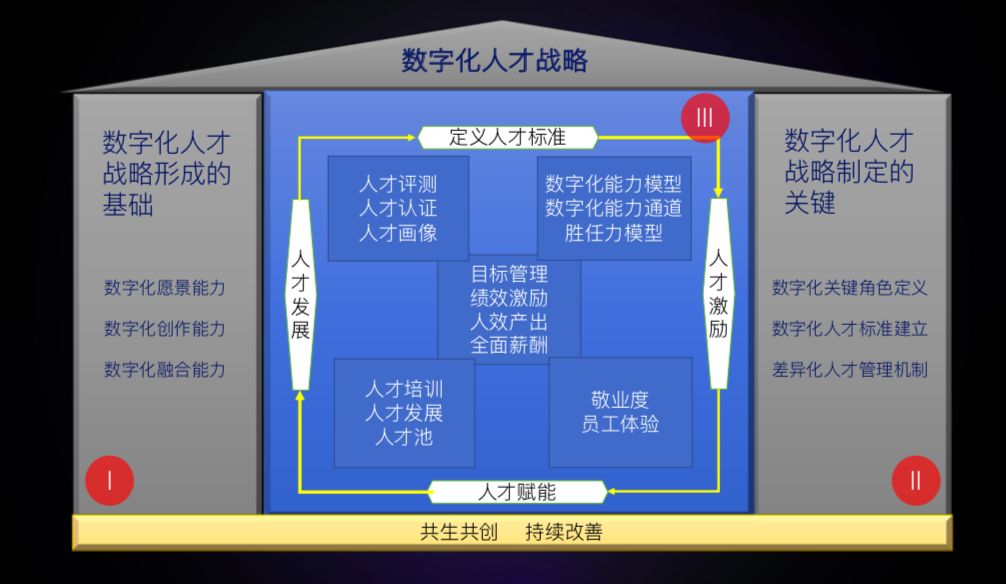 因此应该具备针对数字化能力的人才池的运营和发展,核心是基于数字化能力。过去在做人才池的时候,有分层级的,有分能力发展维度的,也有分接下来可能要面对的挑战的;数字化人才也一样,要依据角色、能力标准、能力的不同维度去运营这些人才。哪一些是需要发展的,哪一些可能是暂时需要用原有的方法去确保目标达成的。这就是基于数字化能力的人才池的运营和发展。