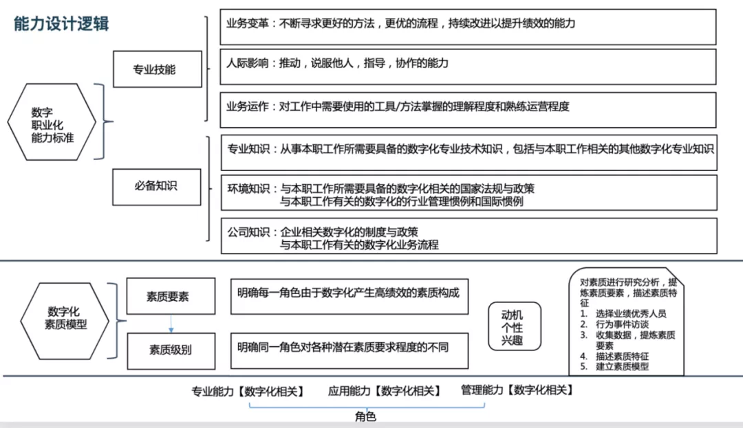 第二点关键是数字化人才标准制定。这是一个样例,是在数字化人才标准的能力设计逻辑下的能力标准和素质模型。