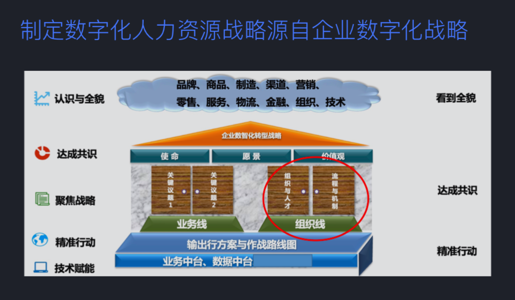 再往下就是人才战略落地的精准行动和相应的技术赋能。看到全貌、达成共识、精准行动,这三点构成了整个企业数字化转型战略落地的框架。我们可以看到画圈那个位置就是人力资源的战略支点。