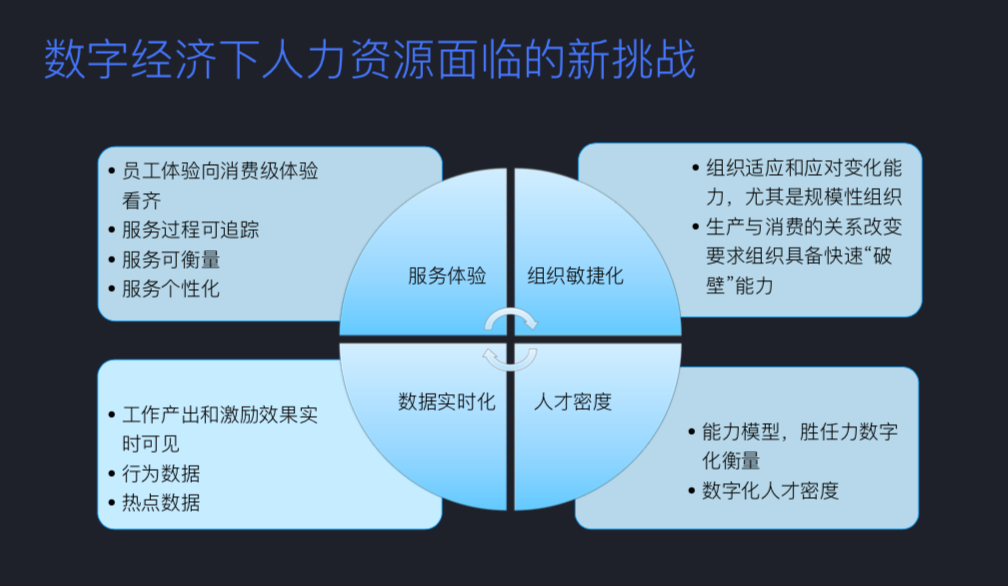 数字化经济给人力资源带来一些新的挑战,在大量数字化产品的熏陶下,我们的客户越来越期待消费级的体验,同时我们的员工也围绕着消费级体验展开工作,各种服务的过程需要追踪,各种服务需要衡量,还有很多定制化、个性化的需求。