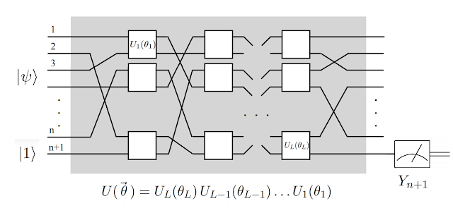 使用量子神经网络执行分类。这里我们描绘了一个示例量子神经网络,相比于经典深度神经网络中的隐藏层,图中的方框代表量子位上的纠缠行为或 “量子门”。在超导量子位环境中,我们可以通过对应每个方框的微波控制脉冲来实施这一行为
