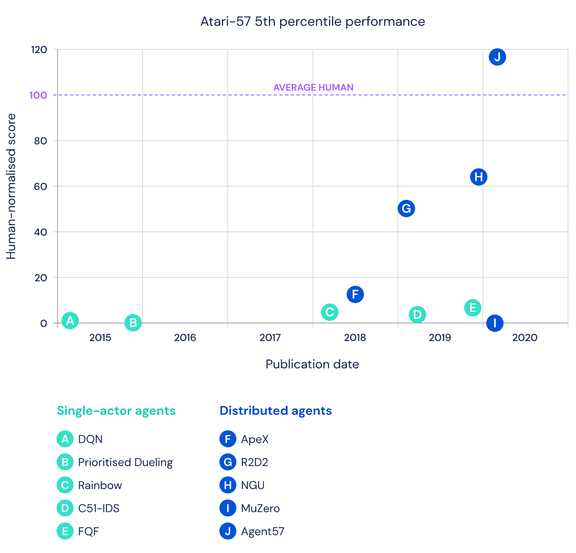 让单个智能体完成尽可能多的任务是 DeepMind 一直以来的研究目标,也被该公司视为迈向通用人工智能的必经之路。去年,DeepMind 推出的 MuZero 在 51 款雅达利游戏中实现了超越人类的表现。时隔数月,DeepMind 在这一方向上更进一步,在 57 款雅达利游戏中全面超越人类,在这一领域尚属首次。