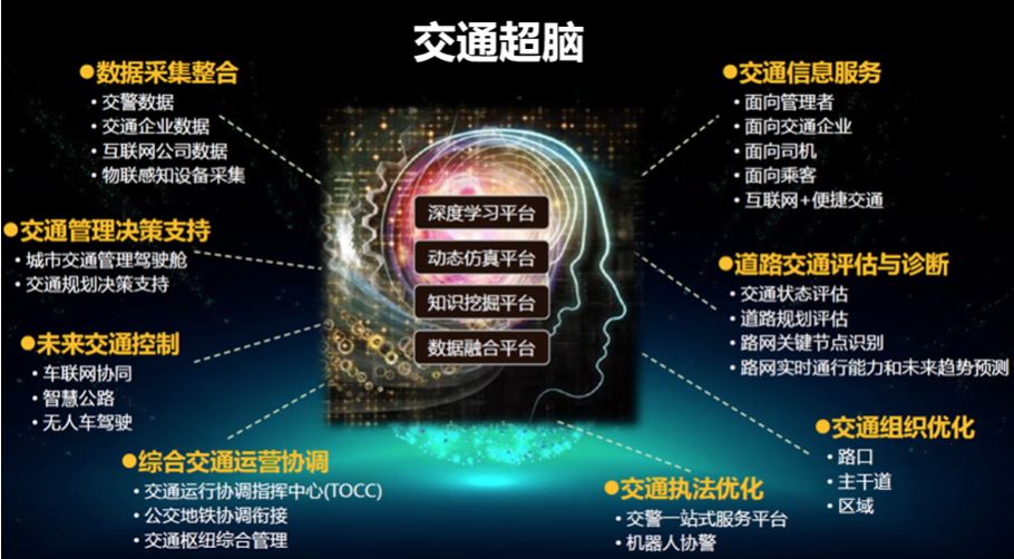 吴建平教授领衔的清华大学-剑桥大学-麻省理工学院“未来交通”研究中心团队研发的交通超脑技术,旨在为解决交通规划、管理、调度、控制等一系列城市交通重大问题提出一体化闭环解决方案。该技术通过在线交通仿真、大数据、人工智能等技术手段的结合,可实现交通态势监控、交通业务管理、交通信息服务、交通信号控制、区域交通组织与交通诱导、交通事件预测预报与应急响应,以此建立综合交通管理平台,使城市交通系统可从每日实时、海量的大数据中学习与决策。未来,随着车联网技术、自动驾驶技术的进一步普及,交通系统这一复杂、开放的巨系统将更加智慧化,如实现区域化的交通流组织、信号灯协同优化控制,更好地实现车辆的诱导与调度,大大提高行车效率与安全。