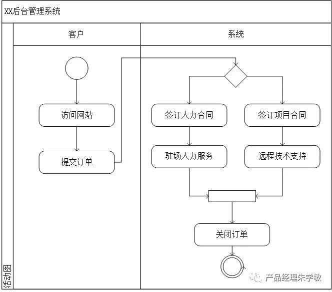 以某业务系统为例,客户完成项目外包的这一活动过程中,分别是用户下单,选择服务,提供服务这三方面完成流程的转换,其实就是侧重从行为的动作描述。