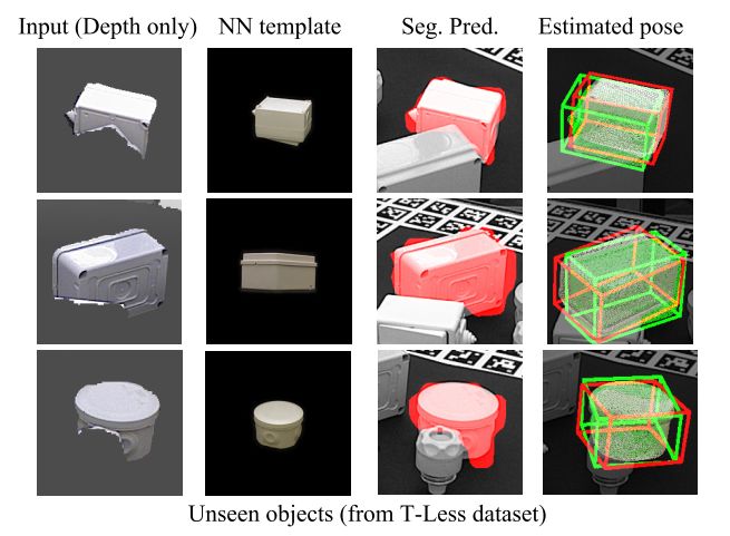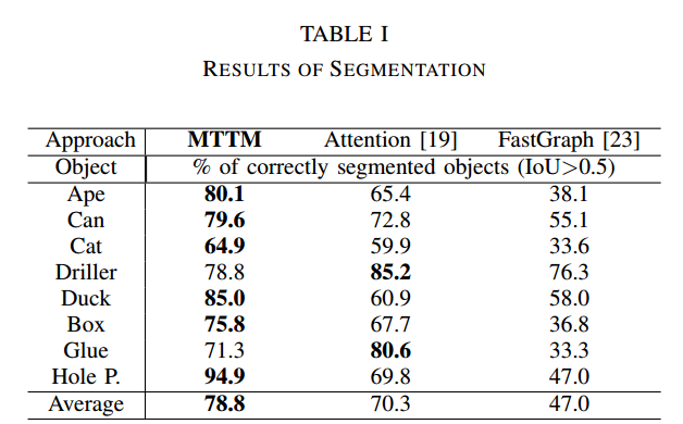 在有限数量的样本下,模板匹配可以准确估计新对象的姿态。然而,估计被遮挡物的位姿仍然是一件具有挑战性的事。此外,深度图像比彩色图像更适合应用于机器人领域常见的无纹理对象情况。在这篇文章中,我们提出了一种新的框架,多任务模板匹配(MTTM),它可以在使用对象区域的相同特征图预测分割掩码和场景中检测到的对象与模板之间的位姿转换时,从深度图像中找到目标对象最近的模板。提出的特征比较网络通过比较模板的特征图和场景的剪切特征来计算分割掩码和位姿预测。该网络的分割结果通过排除不属于该对象的点,提高了位姿估计的鲁棒性。实验结果表明,尽管仅使用深度图像,MTTM的结果仍优于基线方法对被遮挡对象进行分割和位姿估计。