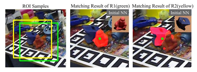 图3 在同一图像中,两个相似ROI的匹配结果。从不同类别检索NN模板会使掩码预测剧烈变化。颜色仅用于可视化。
