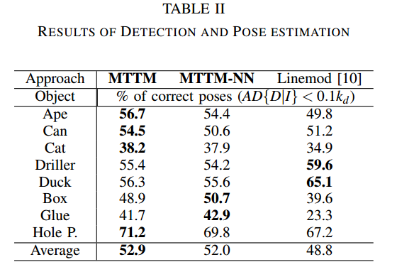 图4 使用真实模板的MTTM样例结果。仅仅使用真实图像代替数据库,没有其他进一步的训练。为了更好的可视化效果,采用了彩色图像而不是实际的深度输入。学习到的特征可以应用于在训练网络时没有展示的物体。绿色边框代表地面真值位姿,红色边框代表预测位姿。