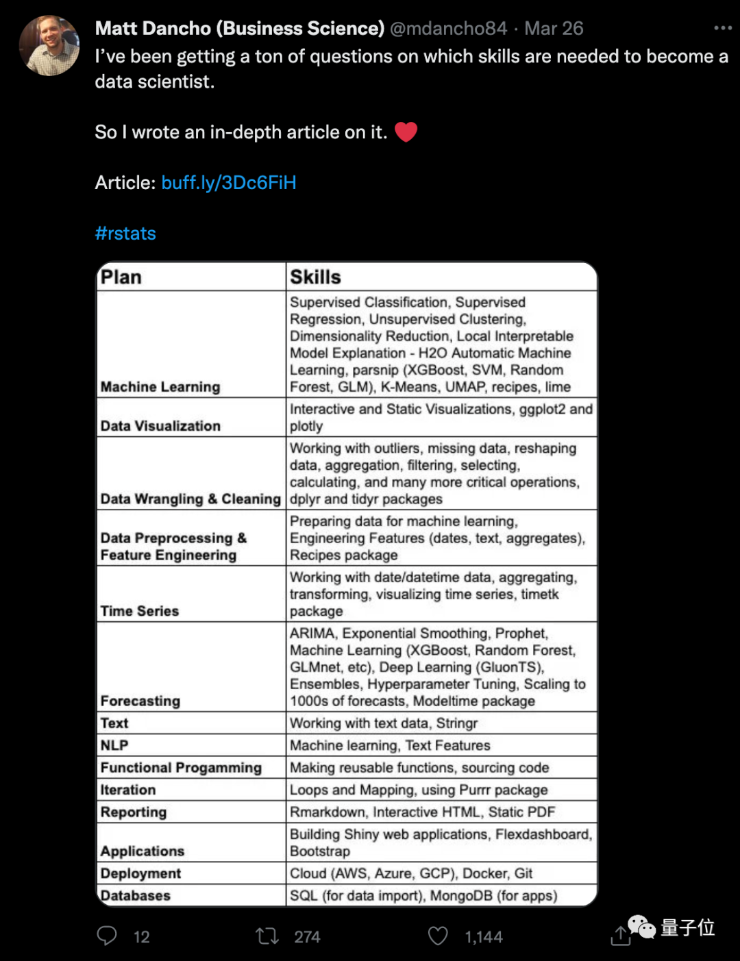 最近,一份数据科学领域的学习宝典在推特上火了,吸引点赞1k+。