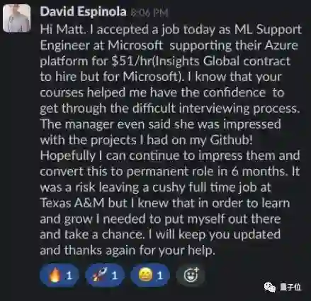 作者表示,有位小哥在他们网站选择了快速进修的课程后,得到了微软机器学习工程师的offer。