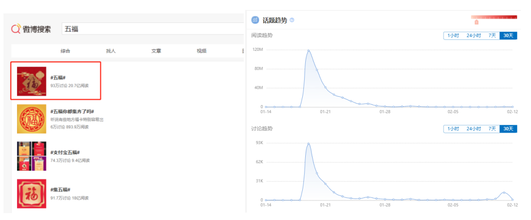 首先,我搜索了微博“五福”话题下阅读量最高的话题,该话题拥有20.7亿阅读。从近一个月的话题趋势中可以发现,该话题最高阅读量在1月19日达到1.2亿,后持续下降。