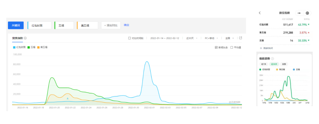 此外,从百度指数和微信指数来说,也是一样的结果(PS:支付宝集五福活动中,五福和集五福都可能是关键词,为了保证对比的一致性,将两个关键词一同计入)。