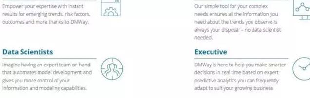 这个创新的解决方案是通过使用专家系统方法而不是“机器人”方法来实现的,模仿有经验的数据科学家关于构建大规模预测模型的方式。DMWay评分引擎是为企业寻求协助部署由分析引擎提供的预测分析结果而推荐的工具。