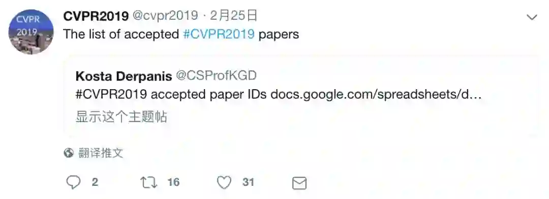 前几日,CVPR 2019 官方推特发布消息公布了本次大会接收论文ID: