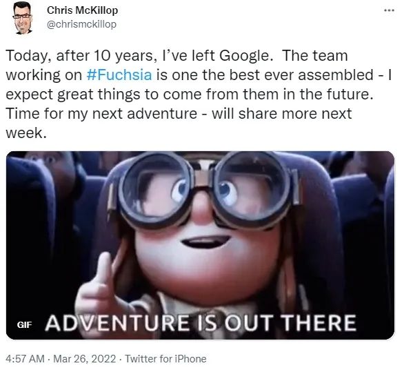 9to5Google 最近报道称,Fuchsia OS 的工程总监 Chris McKillop 已于最近离职。他之于 Fuchsia OS 的核心地位是不言而喻的,他作为项目负责人,主导了 Fuchsia OS 的开发。而作为一名十年谷歌老兵,McKillop 还协助创建了 Flutter 项目团队,并短暂参与 Android TV 电视系统的研发。