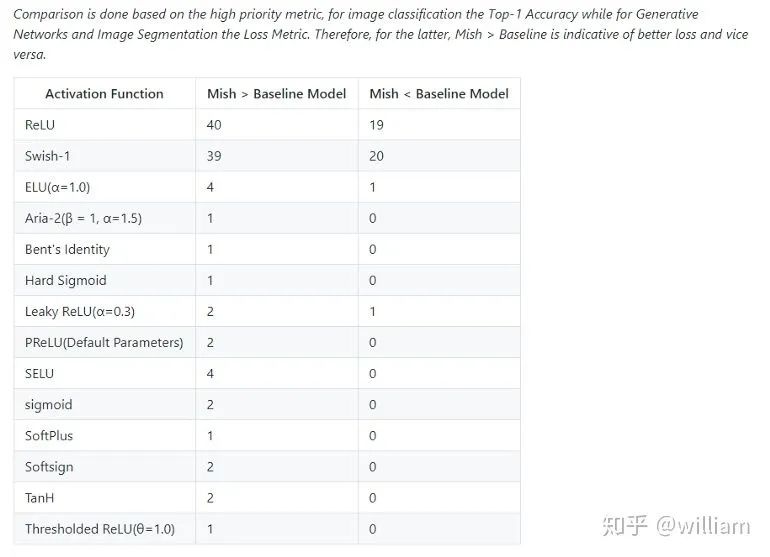 Mish在39个基准测试中击败了Swish,在40个基准测试中击败了ReLU,一些结果显示基准精度提高了3–5%。但是要注意的是,与ReLU和Swish相比,Mish激活在计算上更加昂贵。