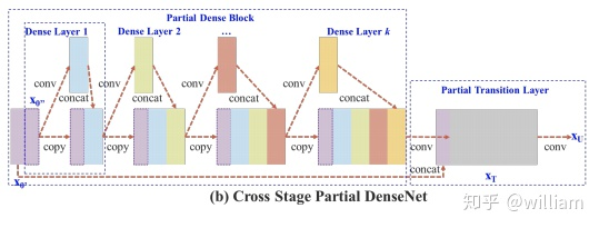 CSPNet实际上是基于Densnet的思想,复制基础层的特征映射图,通过dense block 发送副本到下一个阶段,从而将基础层的特征映射图分离出来。这样可以有效缓解梯度消失问题(通过非常深的网络很难去反推丢失信号) ,支持特征传播,鼓励网络重用特征,从而减少网络参数数量。