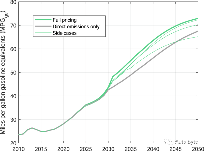 结果显示,当对全生命周期排放进行定价时,电池电动汽车的加速普及,使完全定价的平均燃料经济性比直接排放定价的经济性更高。然而,氢燃料电池电动汽车份额较高的副案(Side cases)表现出显着较低的平均燃料经济性。