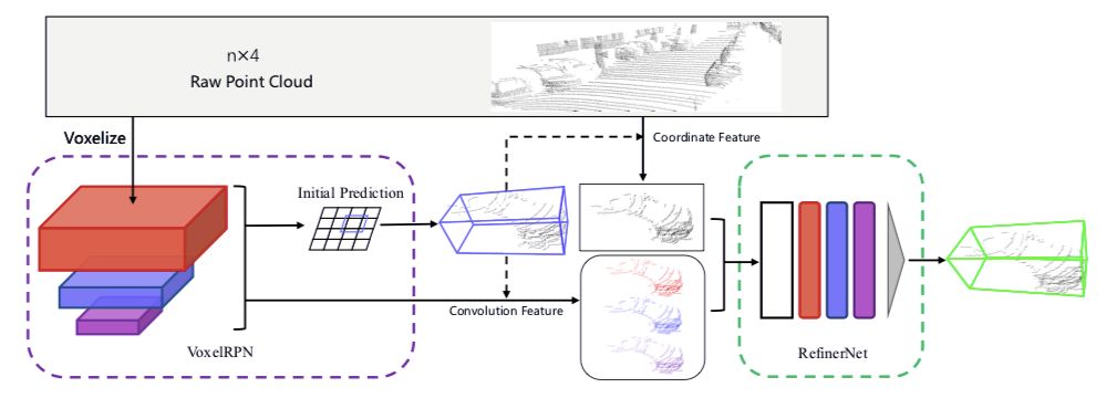 本文提出了一个统一、高效且有效的,基于点云的三维目标检测框架。其两阶段方法采用体素表示和原始点云数据并充分利用了它们的优势。第一阶段的网络,以体素表示为输入,只包含轻量卷积运算,产生少量高质量的初始预测。初始预测中每个点的坐标和索引卷积特征与注意机制有效融合,既保留了准确的定位信息,又保留了上下文信息。第二阶段研究内部点及其融合特征,以进一步完善预测。该方法在 KITTI 数据集上进行了评估,包括 3D 和鸟瞰图(BEV)检测,以 15FPS 的检测速率达到了最先进的水平。