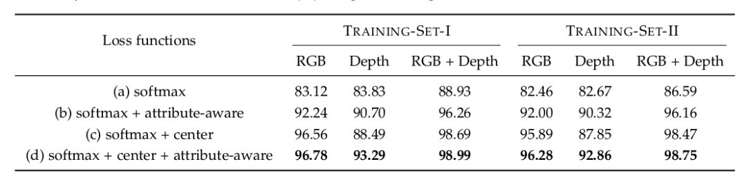 在人脸识别中引入属性的作用,可见图6。在私有测试集上的测试结果可见表1,Training-Set-I和Training-Set-II是我们从百万规模的RGB-D人脸数据集中抽取的出来的两个训练子集,它们都包含了88万张左右具有6万个不同身份的人脸彩色(深度)图像。与 Training-Set-I不同是,Training-Set-II 有着不均衡年龄结构和性别比例。在公开测试集上与其他方法的对比结果,可见表2。