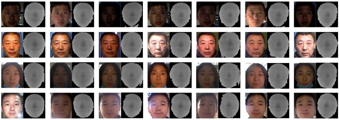 而且我们还构造了一个超大规模的 RGB-D 人脸数据集。该数据集包含超过130万张具有11万个不同身份的人脸彩色图像,其中每张彩色图像对应着一张人脸深度图(可见图4)和属性信息(年龄,性别和民族)。大多数人都是以正面姿态和中性表情面对深度相机进行拍摄的,并且每个人是在不同的时间段和光照条件下被记录的。