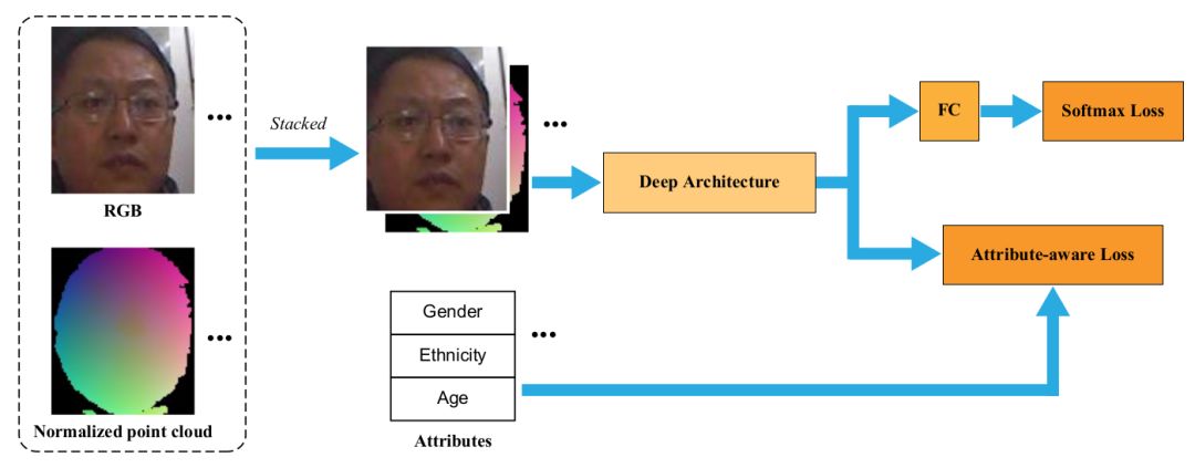 最后我们联合使用Softmax损失函数和属性感知损失函数在这些经过预处理的RGB-D数据上训练人脸识别模型,具体流程可见图5。并在公开的测试集和私有的测试集上验证本文方法的有效性。