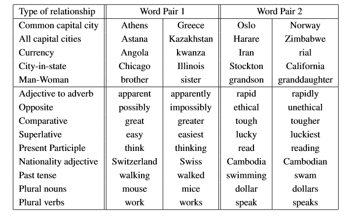 如下表所示,论文中设置了5种语义问题与9种句法问题来测试向量效果,通过类似vec(big)-vec(bigger)≈vec(small)-vec(smaller)的方式来判断。