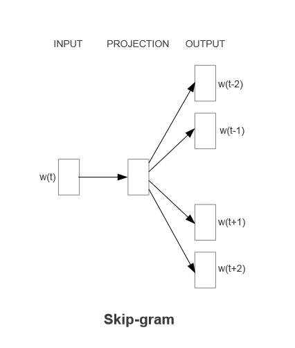 第二种模型结构是Skip-gram(Continuous Skip-gram Model),其思想与CBOW相反:利用中心词预测中心词上下文的n个词(n可自定义),如上图所示,利用中心词预测上下文各2个词,输入层直接等价变化到投影层,然后预测上下文的词。整体公式可以直接表示为: