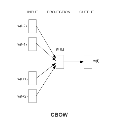 第一种模型结构是CBOW(Continuous Bag-of-Words Model),其思想是利用中心词前面n个词跟后面n个词来预测中心词(n可自定义),如上图所示,用的是前面2个词跟后面2个词预测当前词,输入层直接求和变成投影层,没有其他任何操作,然后直接预测中心词。整体公式可直接表示为:
