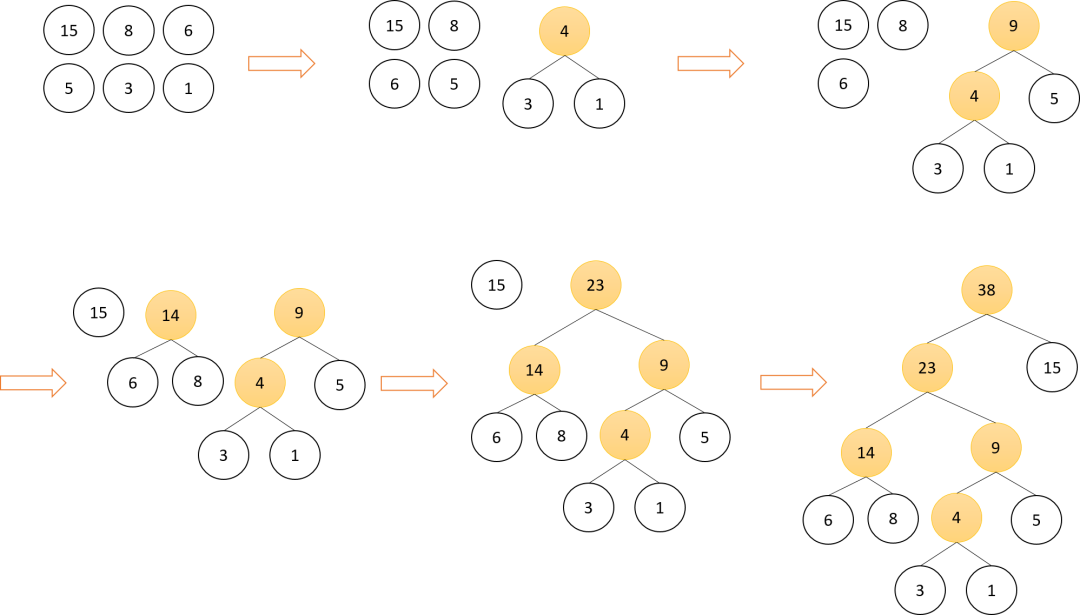 将 看成是有n棵树的森林(每棵树只有一个结点)。 在森林中选出两个根节点权重最小的树合并,分别作为新树的左右子树,新树根结点的权重为左右子树根结点权重之和。 删除森林中选取的两棵树,并将新树添加到森林。 重复上面两步操作,直到森林里就剩一棵树,该树就是huffman树。