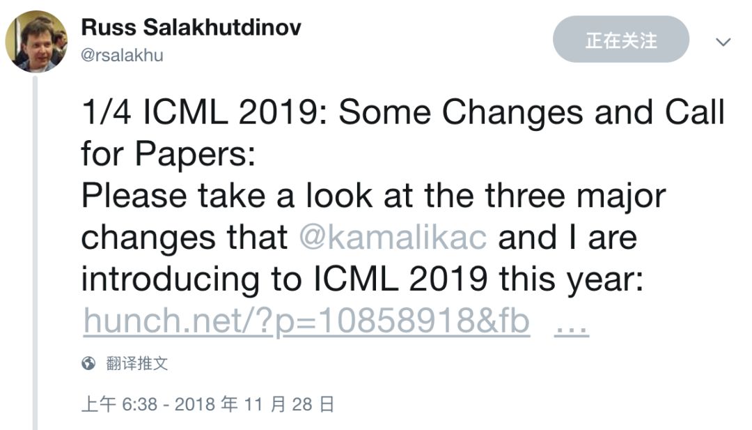 今日,ICML 2019 程序主席之一 Ruslan Salakhutdinov 教授在 Twitter 上表示为了鼓励可复现性和高质量的论文提交,今年 ICML 的程序委员会在论文提交上作出了三项改变。希望机器之心计划提交 ICML 2019 论文的读者们注意。