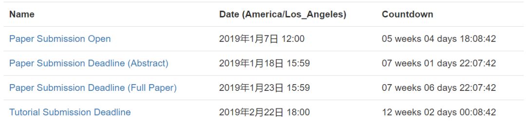 论文提交的开始时间,论文摘要的提交 deadline,full paper 的提交 deadline,以及教程提交 deadline。注意这里显示的是太平洋时间,太平洋时间 2019 年 1 月 7 日 12:00 对应北京时间 2019 年 1 月 8 日 4:00。
