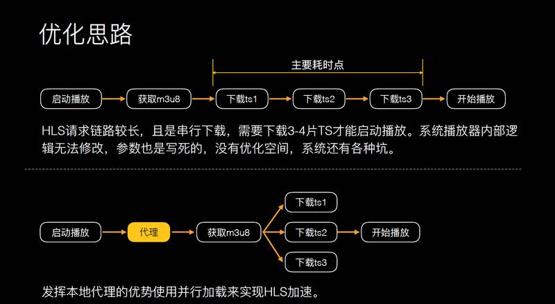 分析发现它的处理也不是很得当,因为安卓系统请求链路较长,串行下载,需要下载 3-4 片 TS 才能启动播放,下载 3 个分片的话,耗时就会很久。之前提到我们这里有代理,有了代理之后做事情方便很多了,通过里获取 M3U8,解析 M3U8 里面有哪些文件,可以做并行下载,只让他下载一次 M3U8,这样下载速度大幅度提升。回到刚才架构上,有了下载代理层的话,你可以做 HLS 的加速和管理,可以加入 HLS 的视频源。