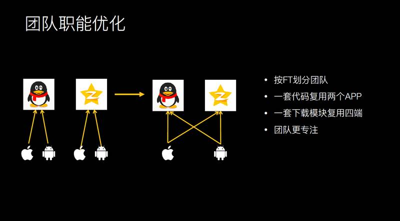 我们团队的职能也做了相应调整,之前可能是按团队划分,四个团队负责四个终端,现在可能是按 FT 的方式划分做视频的团队,iOS 做视频的团队可能负责 QQ 和 QQ 空间里的业务,安卓也是如此。直播的 FT 也可以这样划分,iOS 的负责 iOS 的两个 APP,安卓的负责安卓的两个 APP,这样代码复用更清晰一点,我的团队更专注一点。视频的团队专注视频的研发。