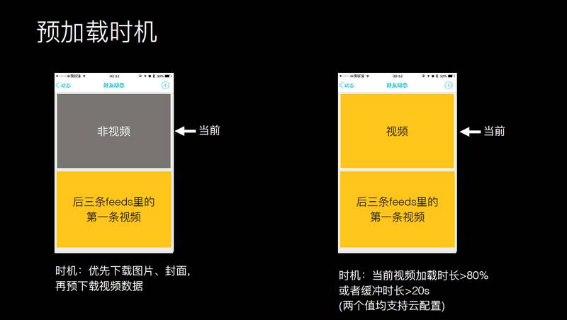 我们会在当前看这条动态时,预加载后面视频的关键信息,比如会加载头部信息和需要播放的数据。在播放当前视频时,加载一定数据之后会加载下一个视频的数据,这些都可以做到的。预加载有一个问题,我们之前踩了一个坑,可能预加载视频时还是要优先图片的。视频当然重要,但是社交网络的图片更重要,可能在预加载视频时会考虑到更高优先级的一些任务。